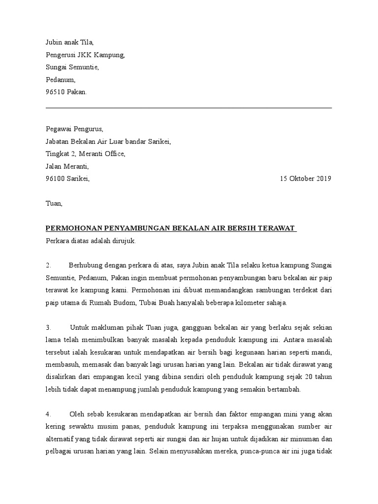 Contoh Surat Rasmi Permohonan Bekalan Air Surat Rasmi O. Contoh surat permohonan air bersih. Contoh surat permohonan bekalan air.